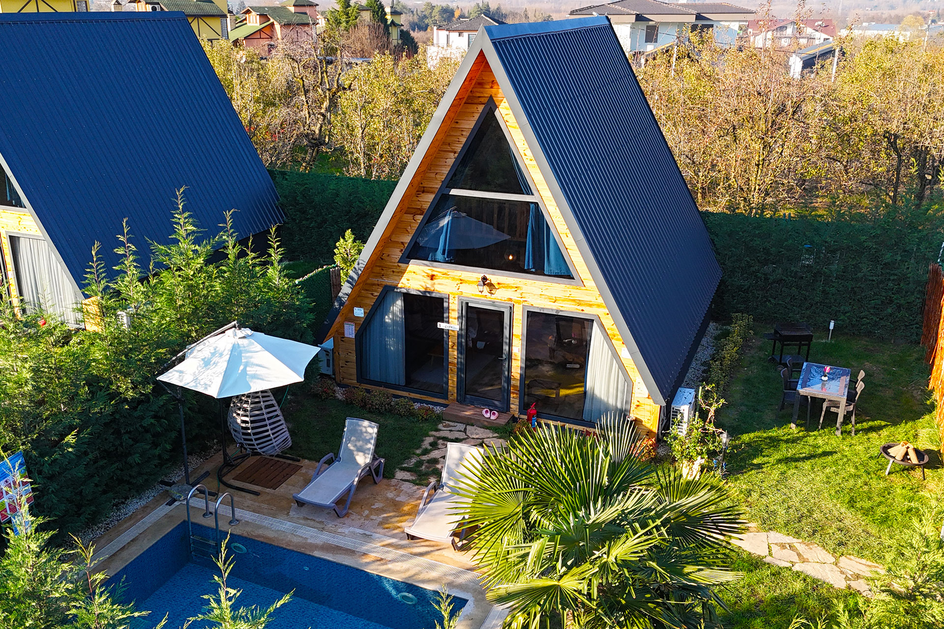 Havuzlu Lüks Bungalov, size özel 200 metrekarelik bahçe içinde yaz-kış tadını çıkarabileceğiniz ısıtmalı havuz, jakuzi, oturma alanı, bir çift kişilik yatağın yer aldığı asma kat ve bir tek kişilik yatak odasından oluşuyor.