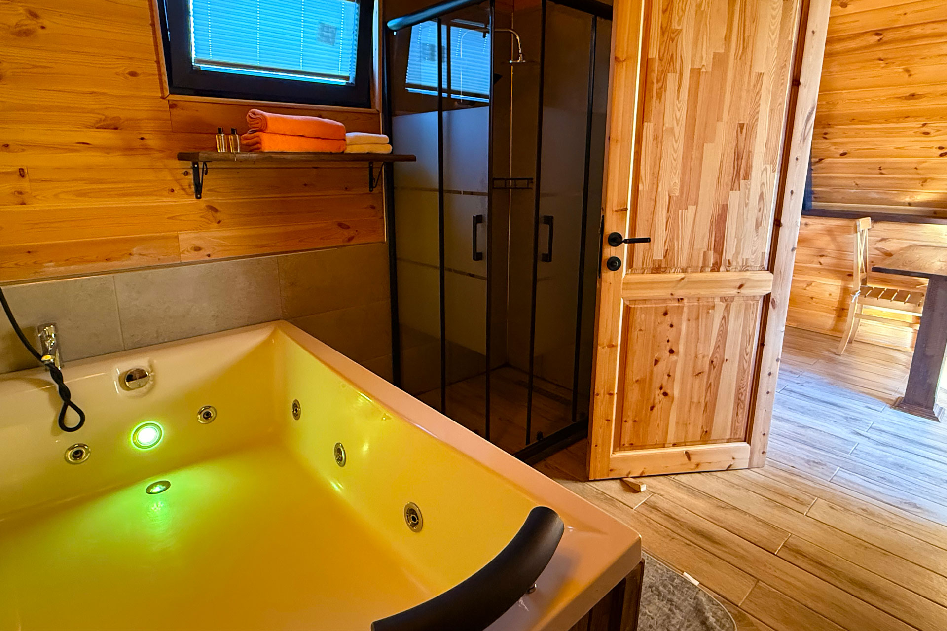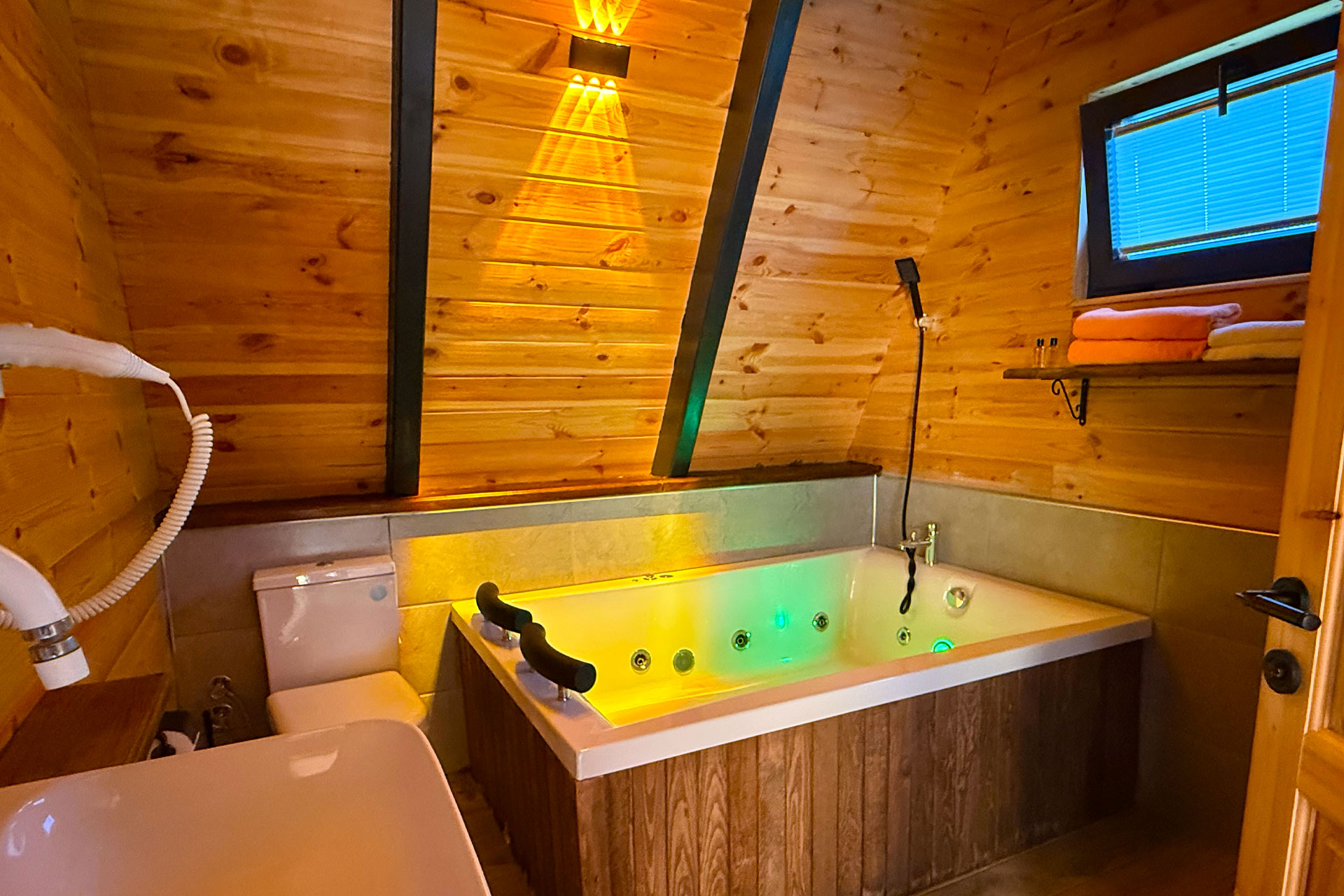 Yaz-kış konaklanmaya uygun Jakuzili Lüks Bungalov’da ayrıca klima, alttan ısıtma, duş, akıllı TV ve WiFi mevcut.