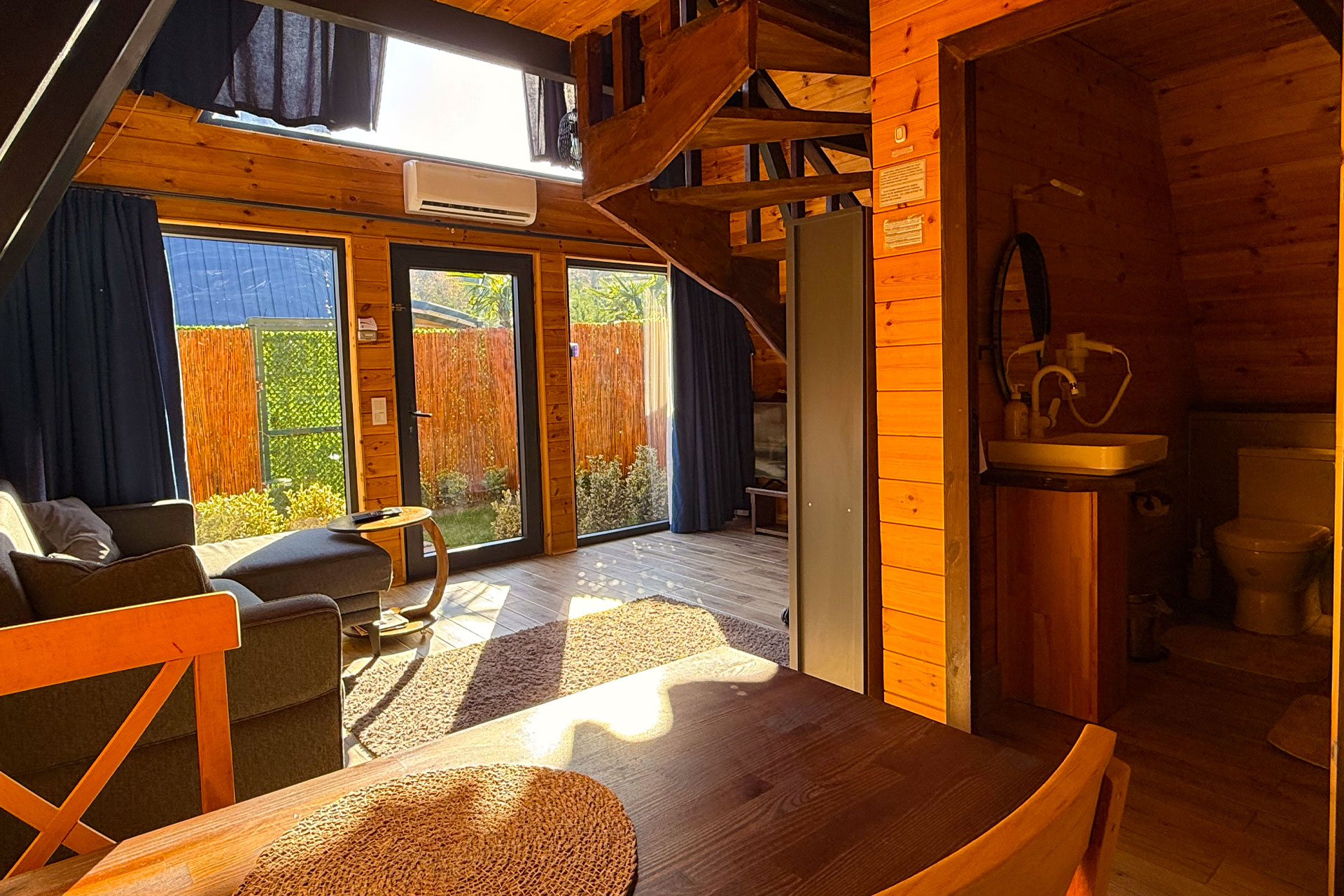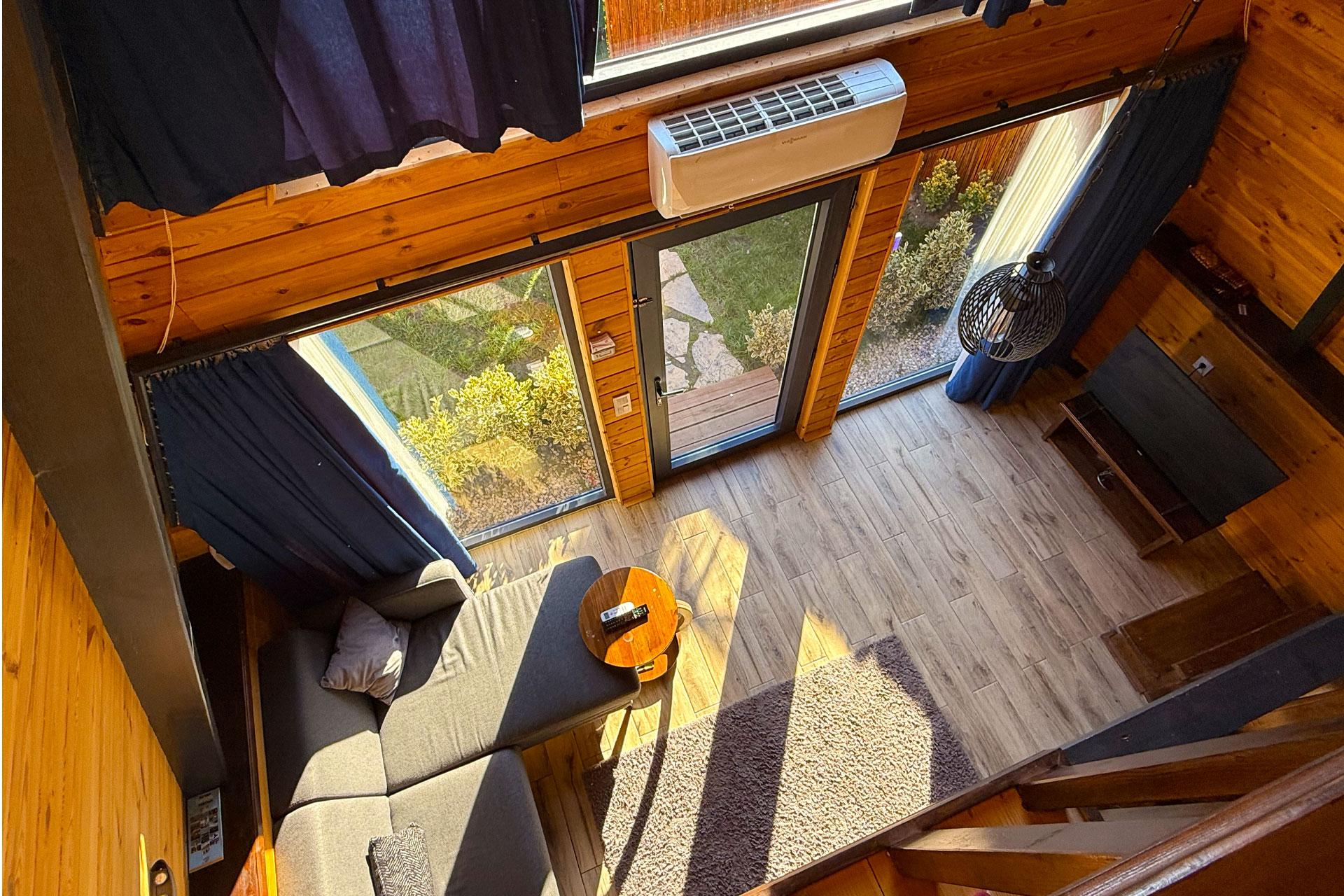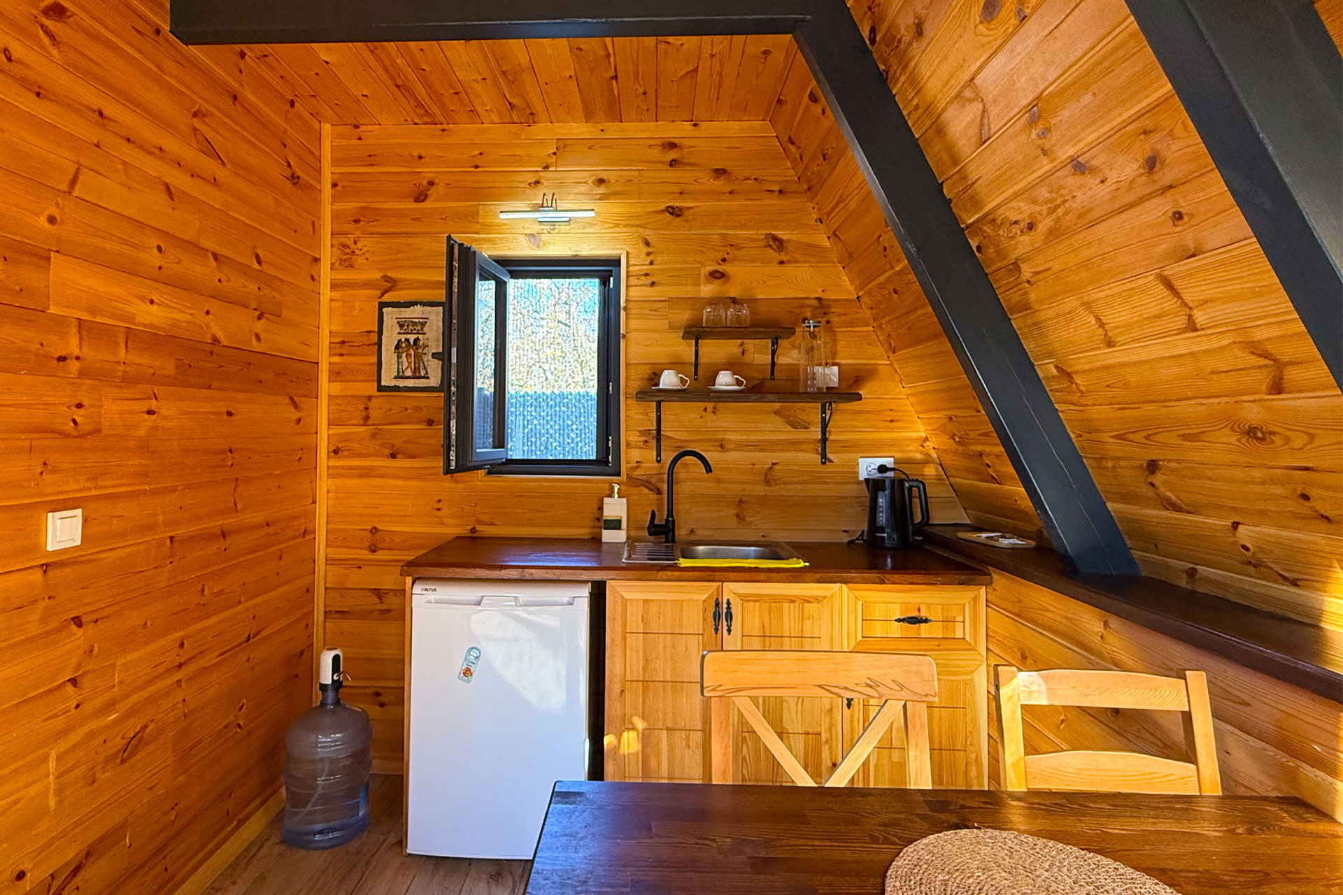Yerden tavana pencereleri ile doğayı bungalovun içinde hissedeceğiniz 32 metrekare oturma alanında bulunan mutfakta, kullanımız için su ısıtıcısı, ocak, mini buzdolabı ve diğer mutfak ekipmanlarını kullanımınız için hazırladık.