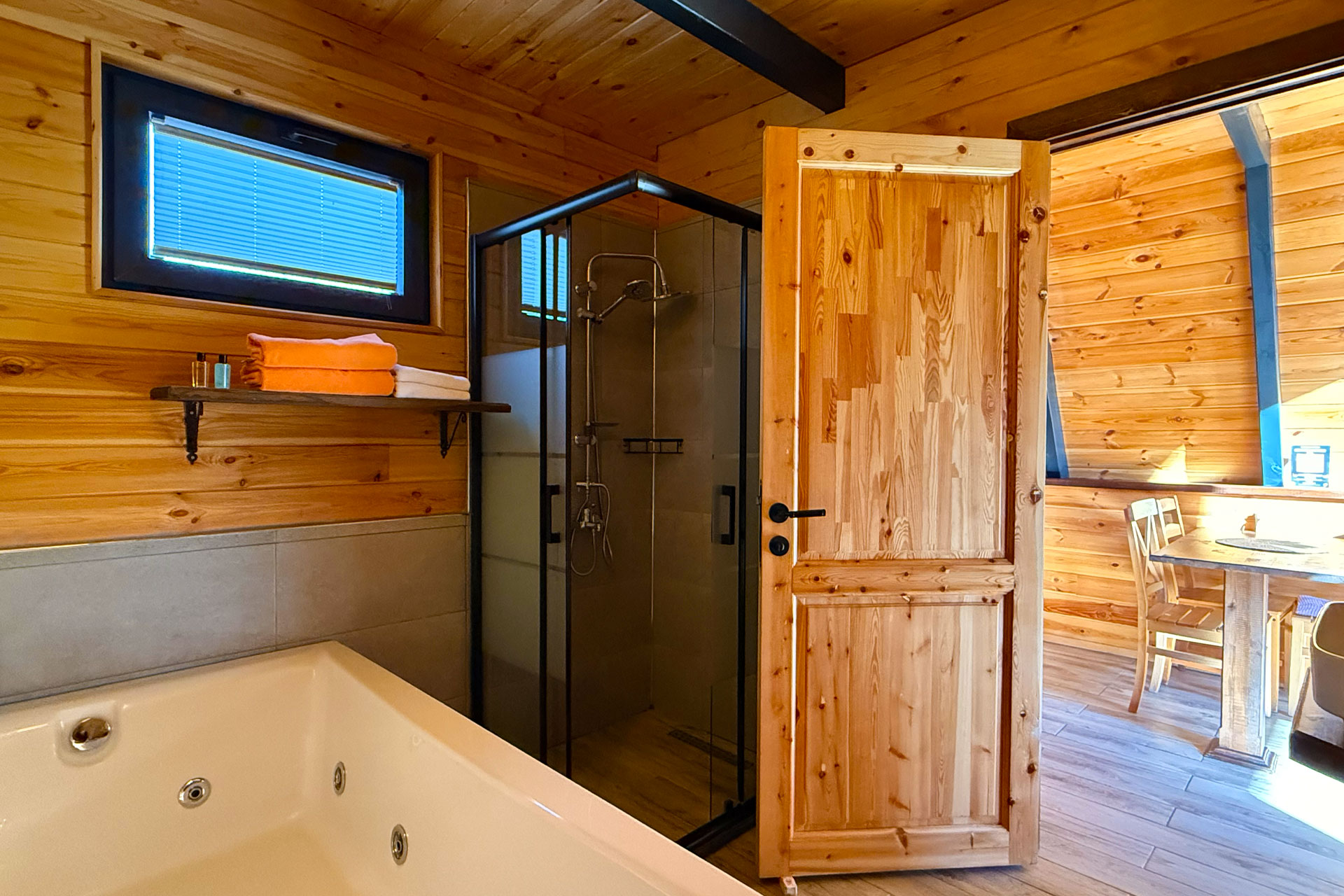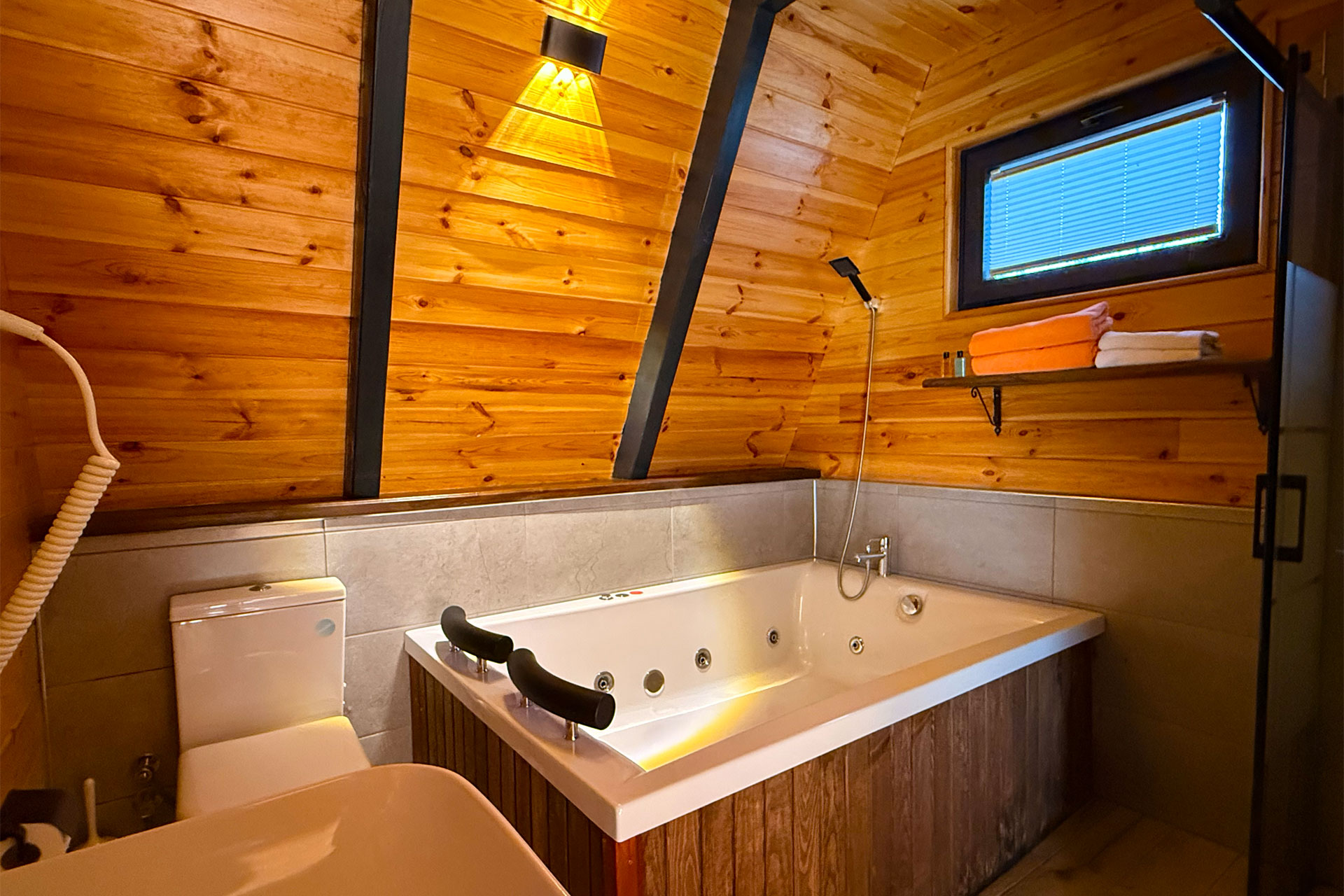 Yaz-kış konaklanmaya uygun Jakuzili Lüks Bungalov’da ayrıca klima, alttan ısıtma, duş, akıllı TV ve WiFi mevcut.
